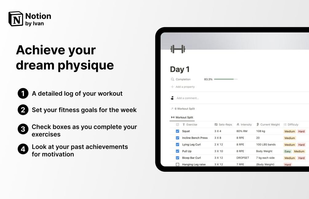 - Exercise tracker for your difficulty, weight, repetitions, etc...